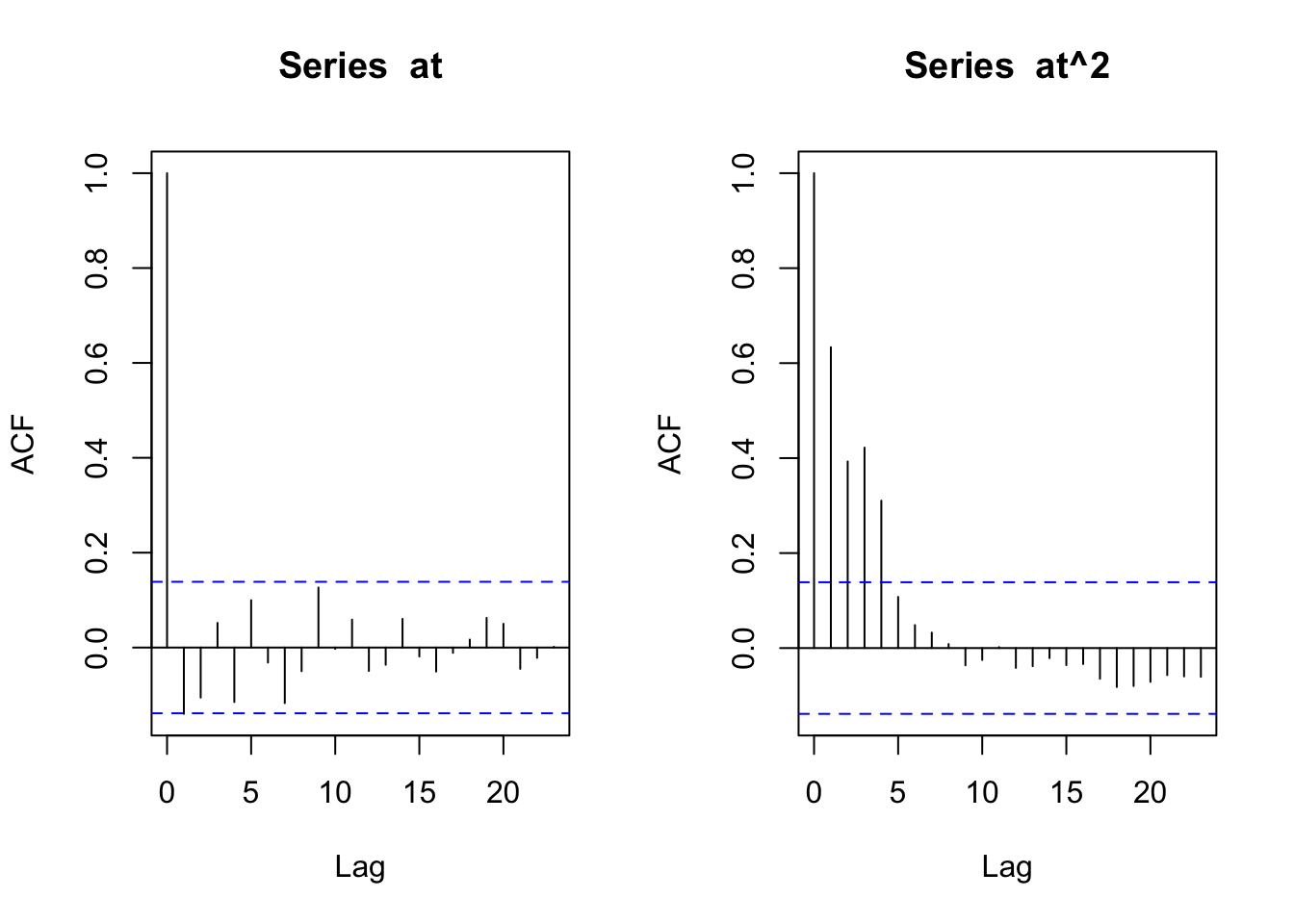 Gdy dopasowuje się model ARIMA(\(p_M, d, q_M\))+GARCH(\(p_V, q_V\)) do szeregu czasowego \(y_t\), istnieją dwa typy reszt. Zwykła reszta, oznaczana tutaj \(\widehat{a}_t\), jest różnicą między wartością rzeczywistą \(y_t\) i warunkową wartością oczekiwaną i stanowi oszacowanie \(a_t\). Aby otrzymać oszacowanie \({\varepsilon}_t\) należy podzielić \(\widehat{a}_t\) przez oszacowane warunkowe odchylenie standardowe \(\widehat{\sigma}_t\). Standaryzowane reszty \(\widehat{\varepsilon_t}\) powinny być używane do sprawdzania modelu: jeśli model dobrze pasuje do danych, to ani \(\widehat{\varepsilon_t}\), ani \(\widehat{\varepsilon_t}^2\) nie powinny wykazywać autokorelacji. Ponadto, jeśli założono, że \(\varepsilon_t\) ma rozkład normalny, to założenie to można sprawdzić za pomocą normalnego wykresu standaryzowanych reszt \(\widehat{\varepsilon_t}\).