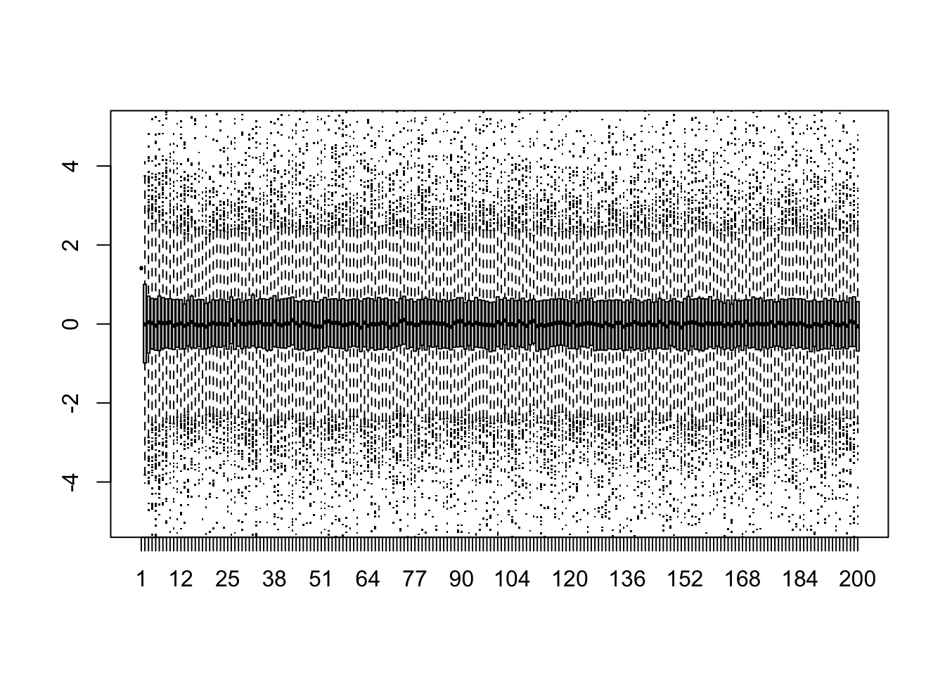 boxplot(t(w), pch='.', ylim=c(-5,5))